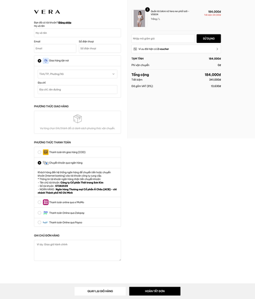 BƯỚC 4: Chọn Thanh toán chuyển khoản ngân hàng, điền thông tin và và bấm Hoàn tất đơn hàng.